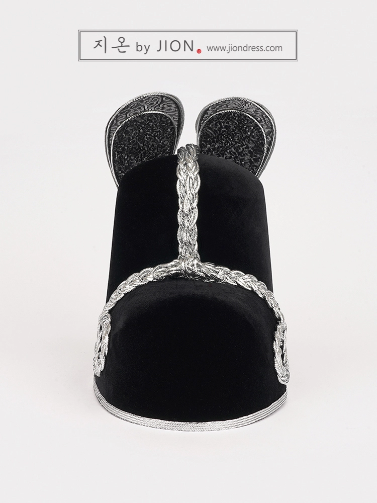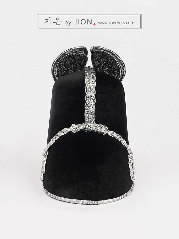 검은색 벨벳 재질에 은띠를 두 번 두른 고급형 익선관입니다.