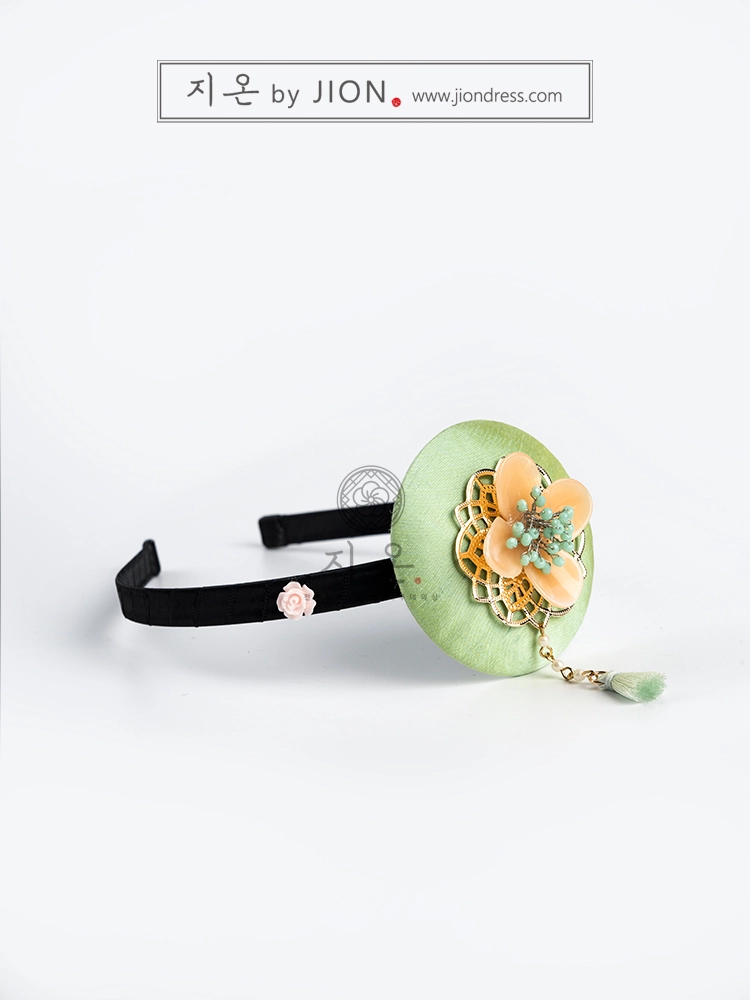 산뜻한 초록색 원판위에 노란 유채꽃이 수줍게 올라간 여아용 배씨 머리띠입니다.