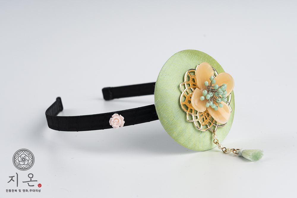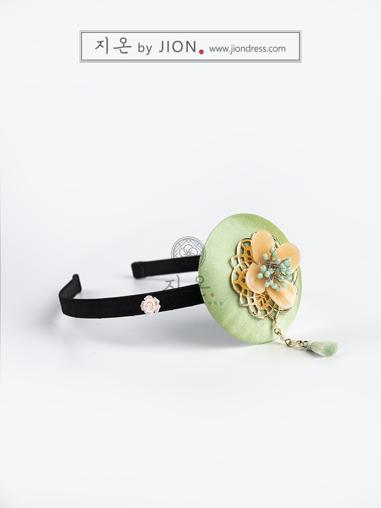 산뜻한 초록색 원판위에 노란 유채꽃이 수줍게 올라간 여아용 배씨 머리띠입니다.