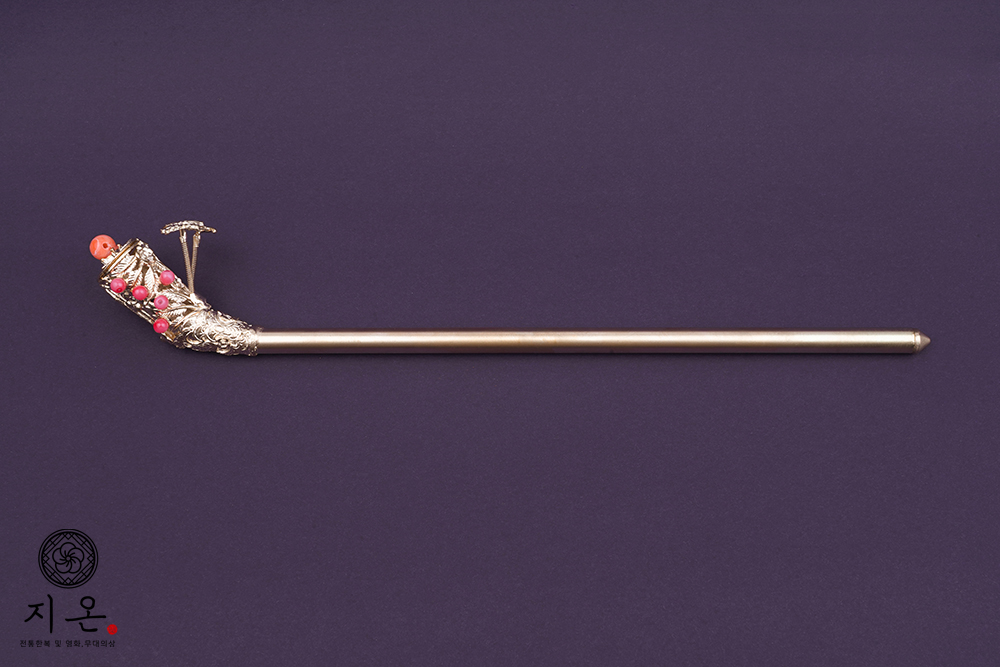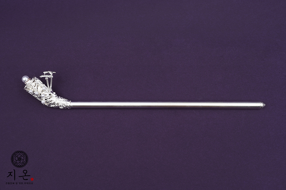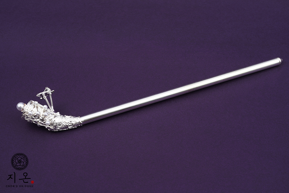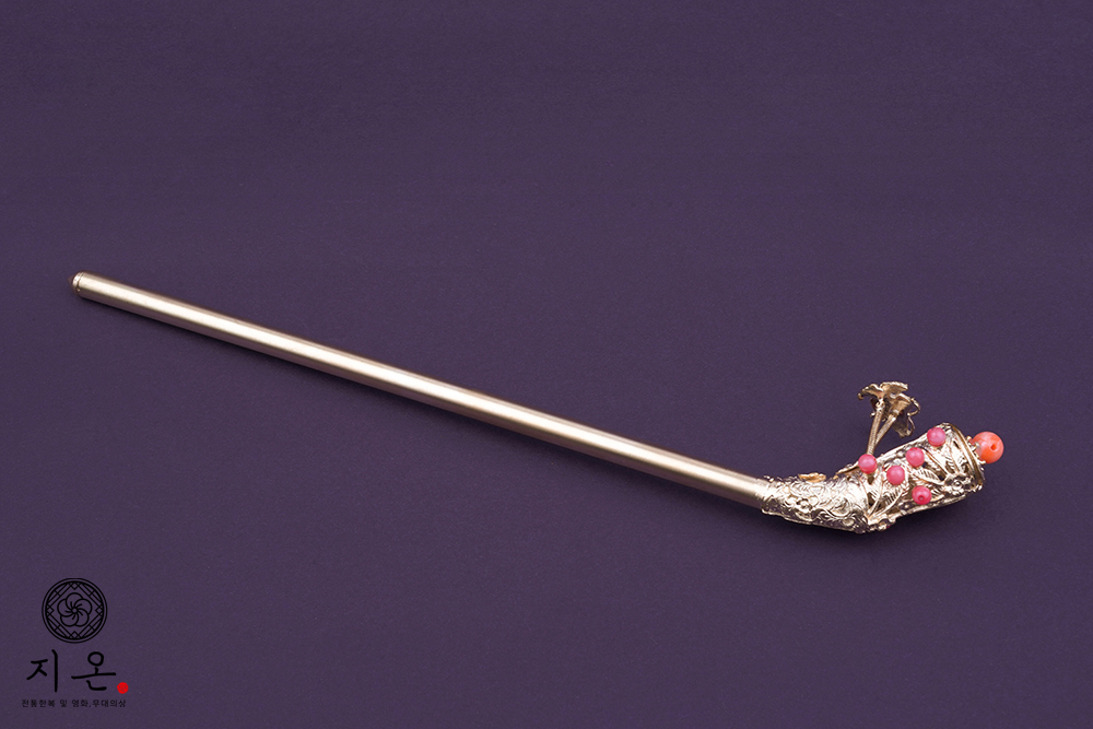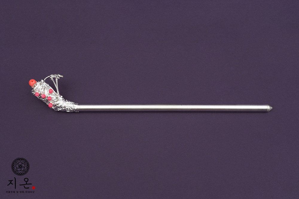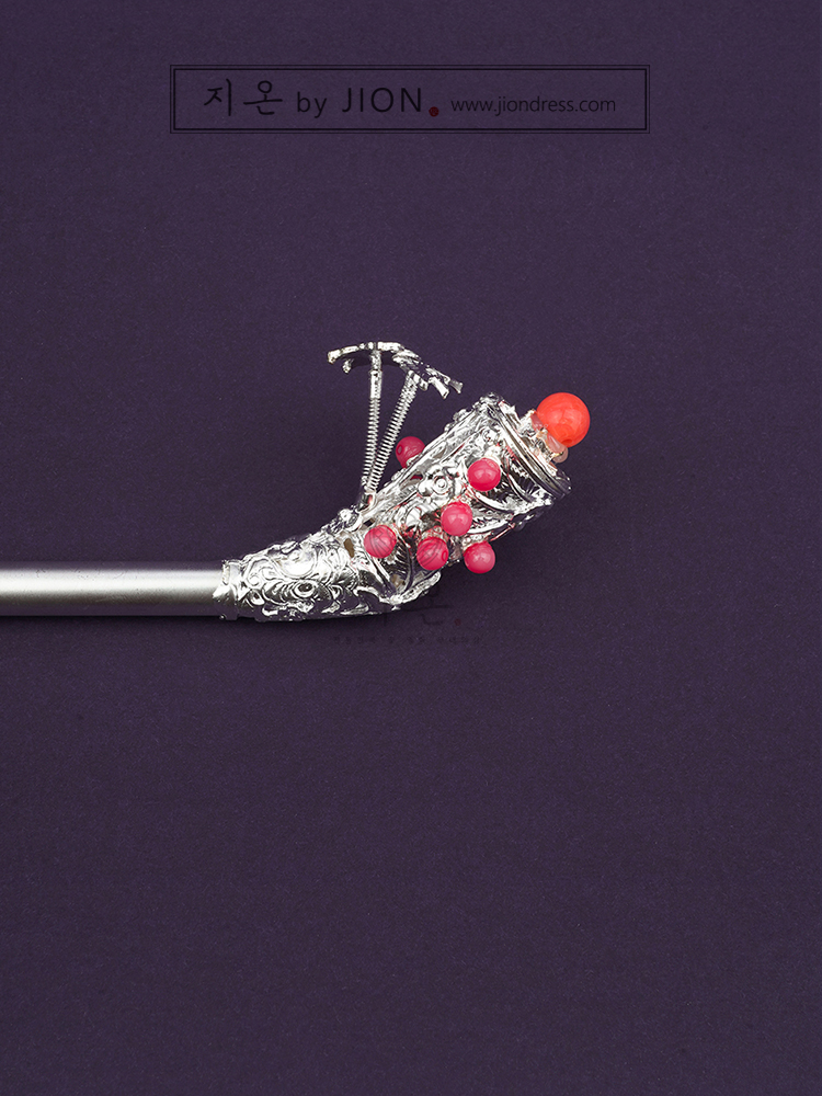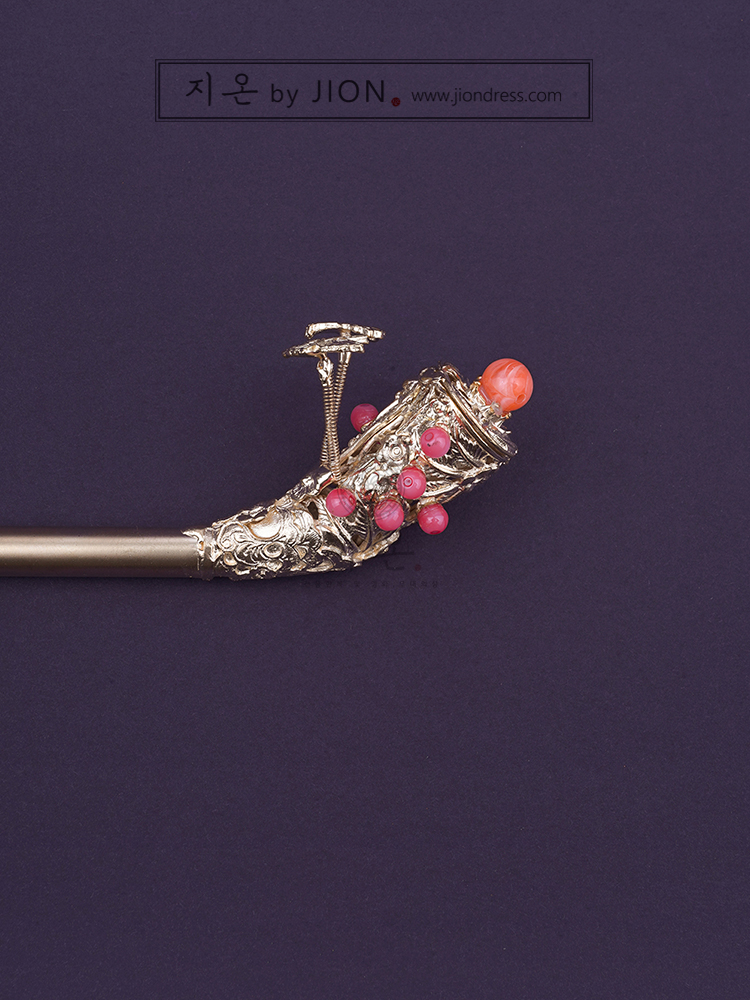은은하게 빛을 발하는 비녀 몸체에 포인트 진주와 산호가 돋보이는 전통 비녀입니다.