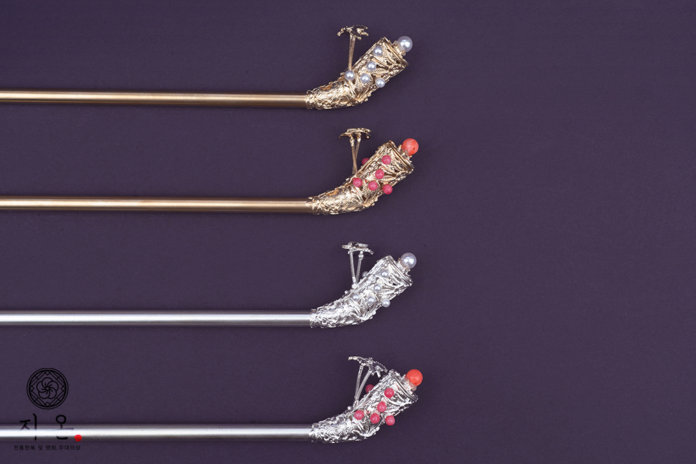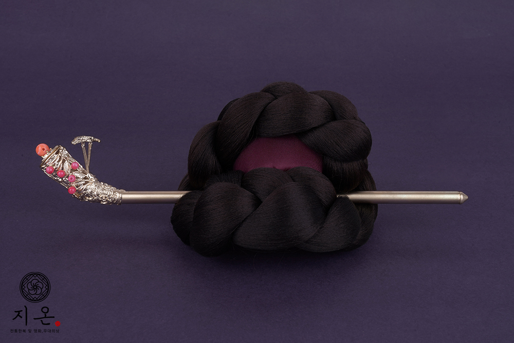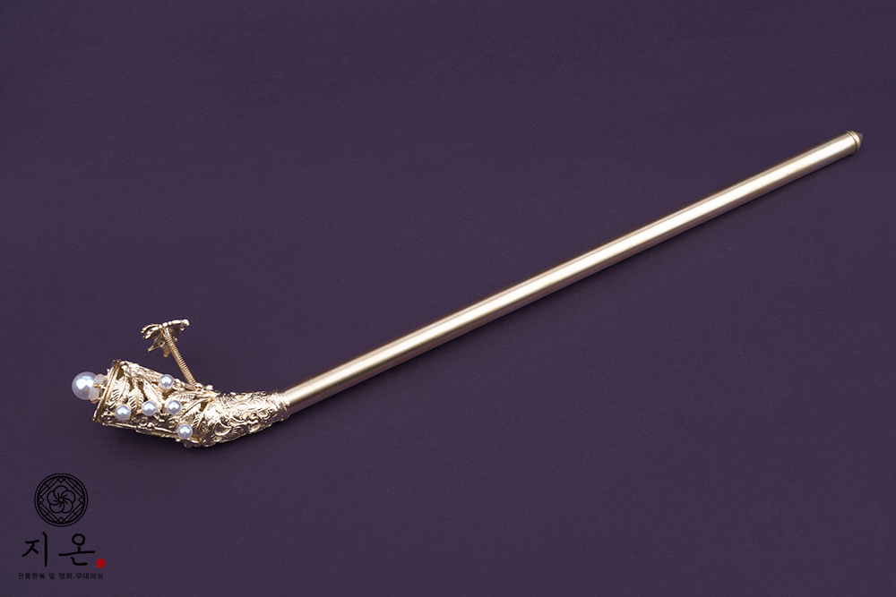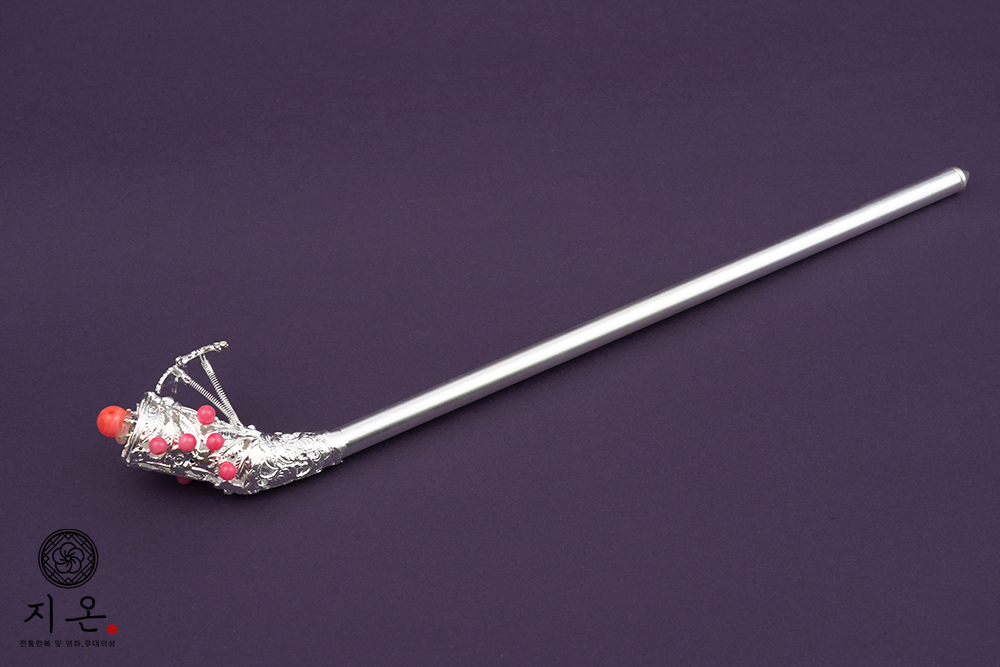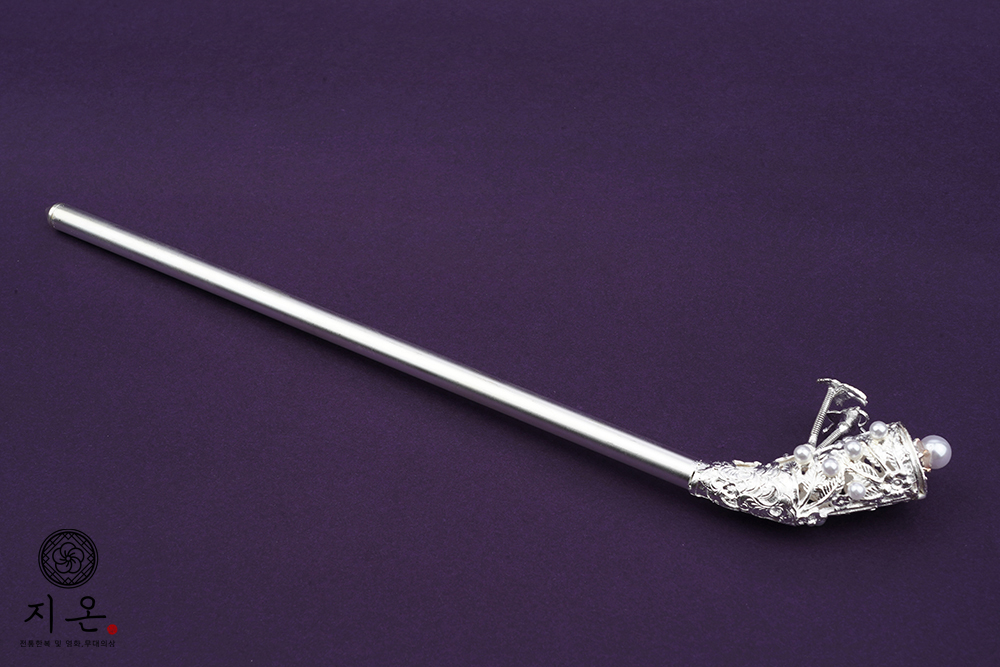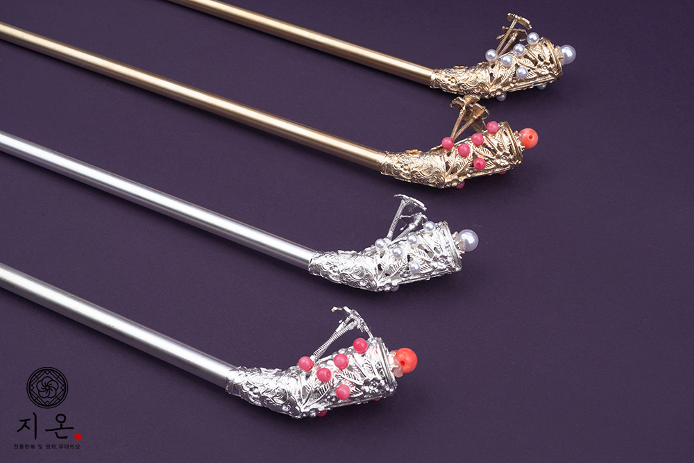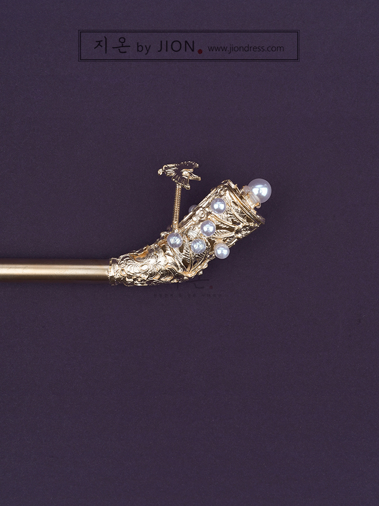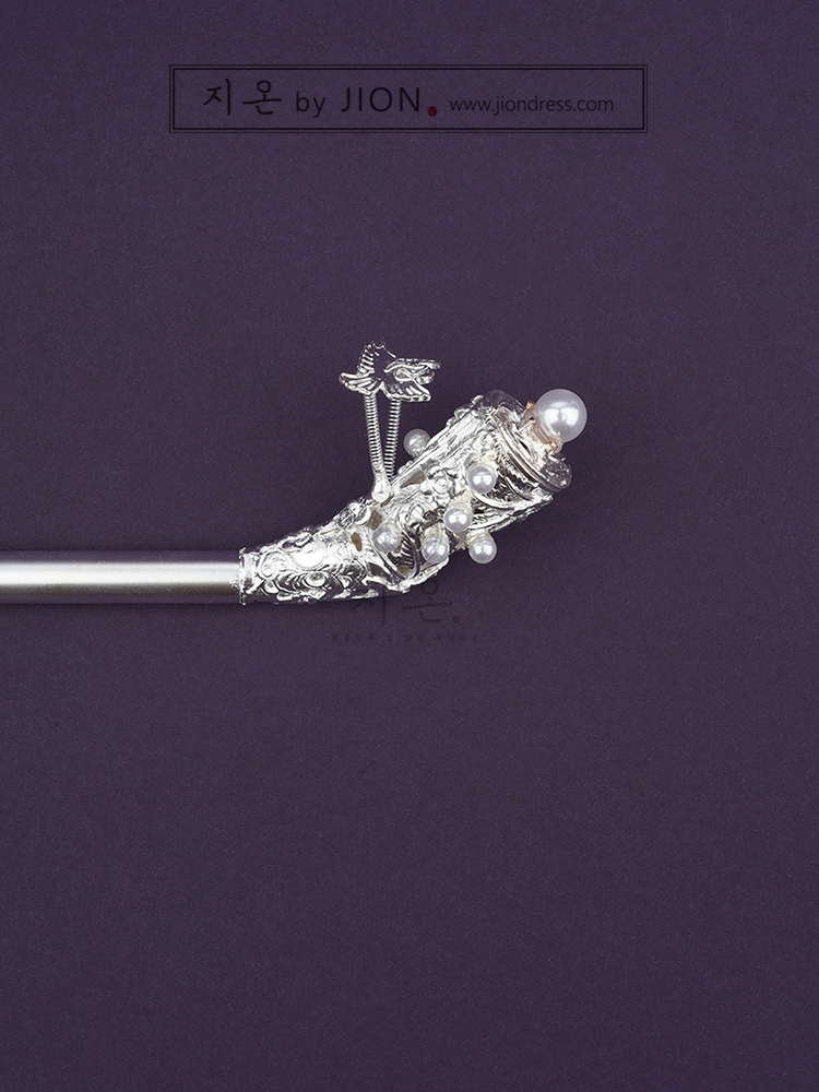 은은하게 빛을 발하는 비녀 몸체에 포인트 진주와 산호가 돋보이는 전통 비녀입니다.