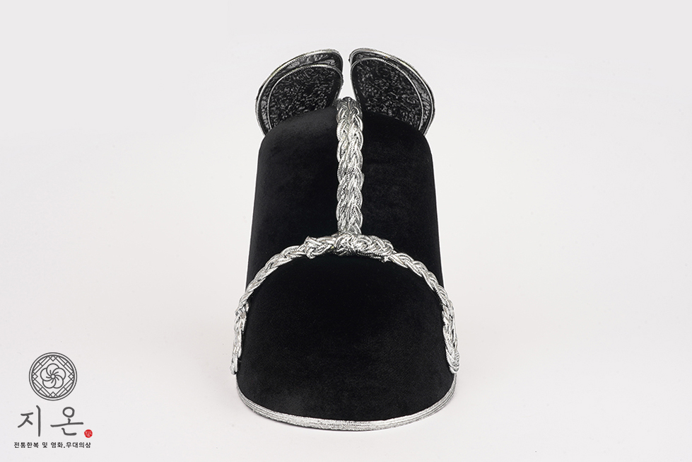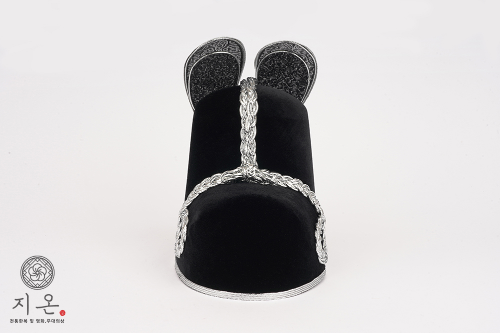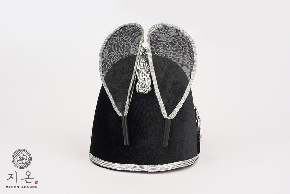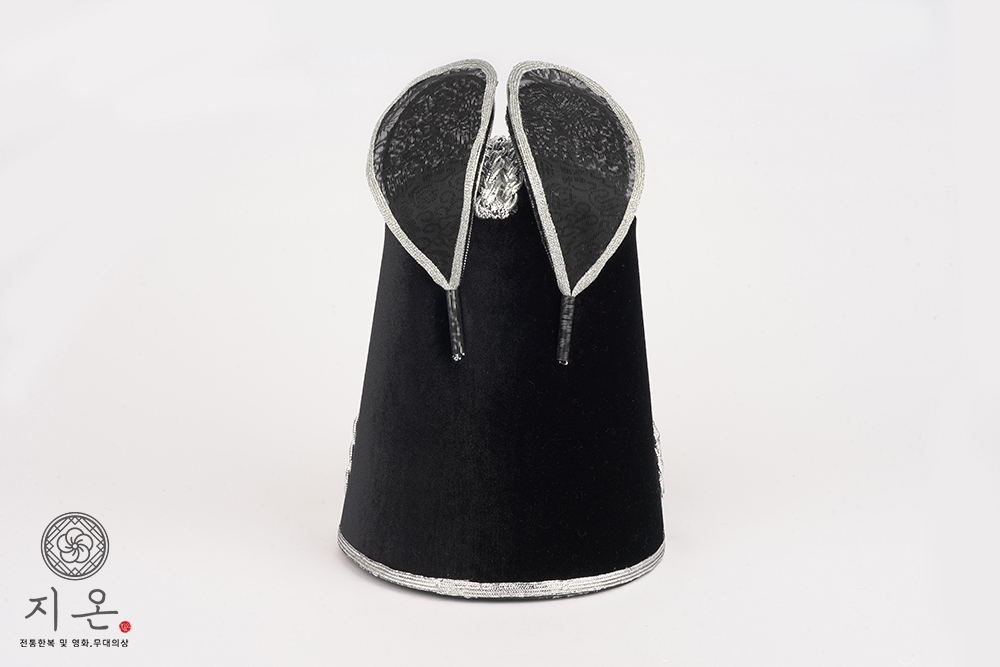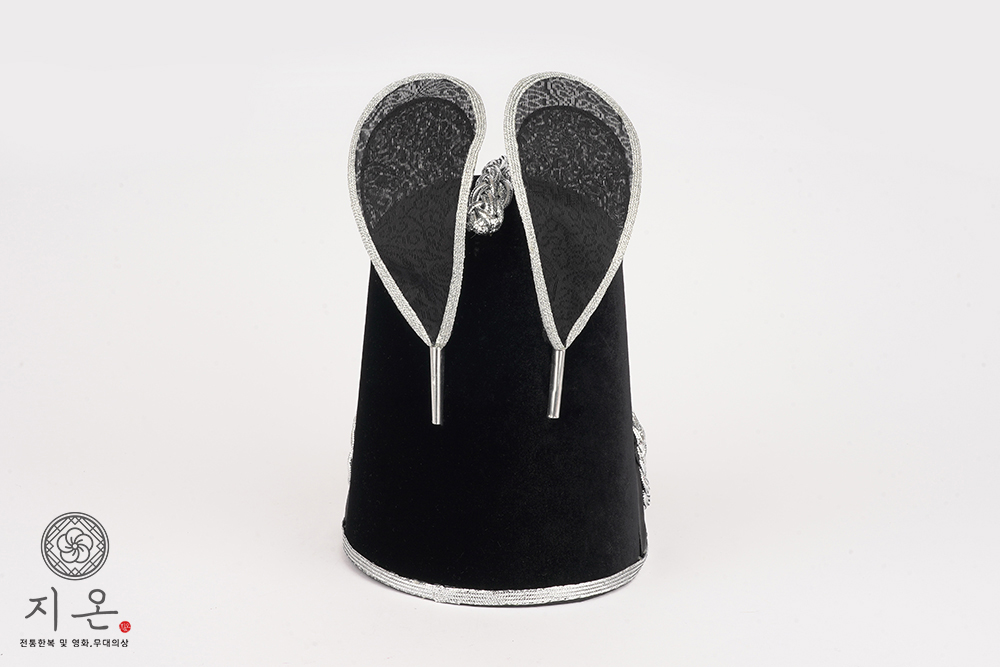 검은색 벨벳 재질에 은띠를 두 번 두른 고급형 익선관입니다.