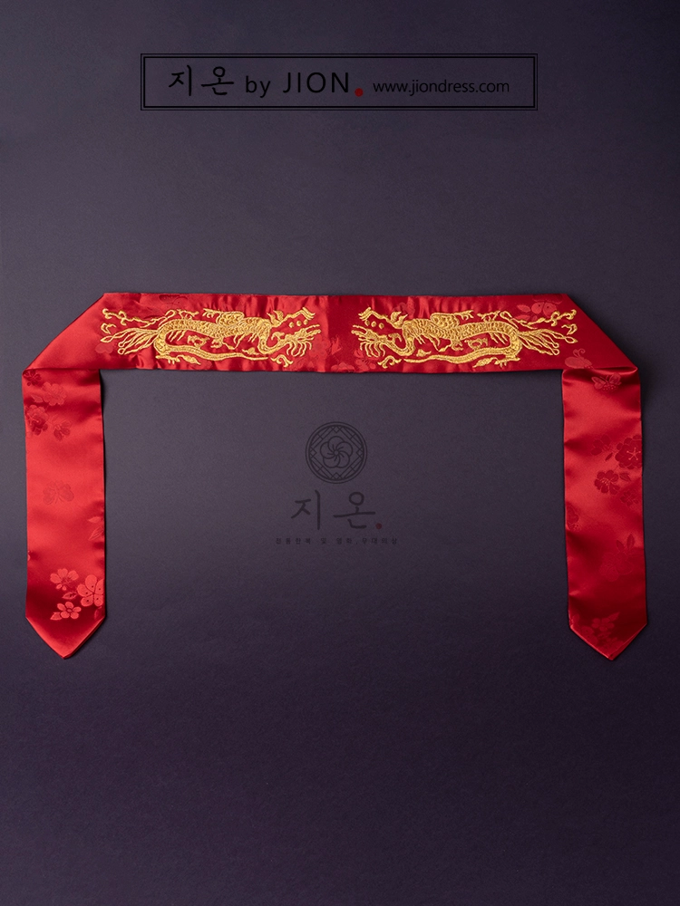 홍색 양단 위에 용을 금사로 힘차게 수놓은 대대입니다.